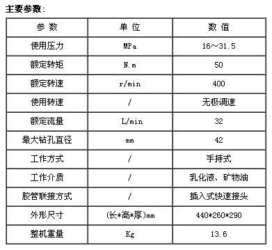 - 一、概述及用途ZRS25-50/400型手持式乳化液鉆機是以采煤工作面支護用乳化液液壓泵站為動力源,以液壓能轉化為機械能以轉矩輸出方式實施煤層鉆孔的機械。并可分為干式鉆機及濕式鉆機兩種。濕式鉆機鉆孔時其中絕大部分乳化液經(jīng)回液管回到泵站繼續(xù)使用,一小部分乳化液從鉆機本身自動分出經(jīng)空心鉆桿到鉆頭以實現(xiàn)濕式除塵(濕式鉆機需訂貨時提出)。ZRS25-50/400型手持式乳化液鉆機具有轉矩大、重量輕、鉆孔速度快,不需用電及電器綜合保護裝置,可實現(xiàn)安全生產(chǎn)。并可針對不同硬度的鉆孔物質可以做到無級調節(jié)鉆孔轉速。ZRS25-50/400型手持式乳化液鉆機適用于煤層鉆孔、礦壓鉆孔、挑頂、臥底,特別在綜采工作面使用更為方便。二、ZRS25-50/400型手持式乳化液鉆機型號含義Z: 產(chǎn)品類別代號-礦用回轉鉆機R: 第一特征代號-乳化液S: 第二特征代號-手持式25: 第三特征代號-最大工作壓力,單位為兆帕(MPa)50/400:主參數(shù)-額定轉矩/額定轉速,單位為 牛米(N.m)/轉每分鐘(r/min)三、ZRS25-50/400型手持式乳化液鉆機特點1、 不需用電及電器綜合保護裝置;不需增加水源及其它供水裝置可實現(xiàn)濕式鉆孔。2、安裝聯(lián)接使用方便;具有轉矩大、重量輕、鉆孔速度快等優(yōu)點。四、ZRS25-50/400型手持式乳化液鉆機技術參數(shù)
