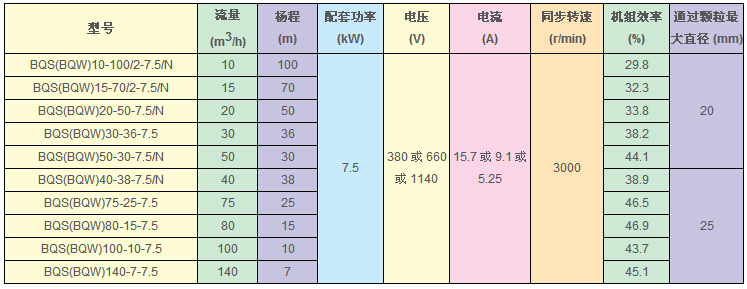 BQS(W)7.5KW的礦用隔爆型排污排沙潛水電泵技術參數(shù):