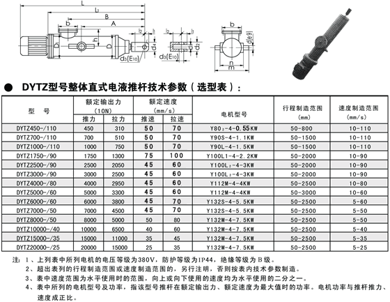 - DYTZ型整體式電液推桿是一種集機、電、液為一體的液壓驅動機械手,適用于需要往復推拉直線(或往復旋轉一定角度)運動,也可用于需要上升、下降或夾緊工作物的場所,并可實現(xiàn)遠距離危險地區(qū)的集中或自動控制。DYTZ型整體式電液推桿廣泛應用于冶金、礦山、電力、煤炭、機械、交通、糧食、化工、水泥、水利、建材、運輸?shù)炔块T,是一種通用的動力源。DYTZ型整體式電液推桿是一種機、電、液一體化的新型柔性傳動機構,它以執(zhí)行機構(油缸)、控制機構(液壓控制閥組)和動力源(油泵電機等到)組成。根據(jù)現(xiàn)場安裝空間及用戶使用情況電液推桿可有多種結構形式(具體見電液推桿外形尺寸圖,也可根據(jù)用戶要求定制樣式)。電動機通過正反轉驅動雙向液壓泵正反輸出壓力油,經(jīng)液壓控制閥送至油缸,也實現(xiàn)活塞桿的往復運動。液壓控制閥組主要由溢流閥,吸油單向閥,調速閥(用戶要求),液控單向閥(液壓鎖)等組成也可根據(jù)電液推桿的工作特性,設計不同功能的油路組合閥,滿足其工作要求。一般有推出自鎖,拉回自鎖和推拉均自鎖;運行速度有可調速型,不可調速型;電液推桿工作角度有水平推,向上推(包括斜向上),向下推(包括斜向下)等幾種。電液推桿主要有以下優(yōu)點:(1)結構緊湊、安裝方便、占據(jù)空間小、維護簡單。(2)可帶負荷起動,具有過載保護功能。(3)回路設雙向液壓鎖,可停在規(guī)定行程范圍內的任意位置并自鎖,且保持輸出力不變。(4)推拉力,速度(用戶要求)無級可調,驅動力范圍極廣。(5)因故斷電,推桿自鎖,避免發(fā)生事故。(6)采用全液壓傳動,動作靈敏,運行平穩(wěn),能有效緩沖外來沖擊力,行程控制精確(≥0.5mm)(7)機電液一體化全封閉結構,工作油路循環(huán)于無壓的封閉鋼筒里,體積小,不滲油,在惡劣的工作環(huán)境下,不吸塵,不進水,內部不銹蝕,使用壽命長。DYTZ型整體式電液推桿是我公司成立前針對國內中,大推力檔電動拉桿產品空白,而顧客又有需求的情況下于1988年起率先自主開發(fā)并獨家生產的系列產品,是我公司多種電動推拉桿系列產品之一。該產品已在首鋼,包鋼等多家大鋼鐵企業(yè)推廣應用,也可用于其他需要大推,拉力的場合。其使用條件為環(huán)境溫度-15℃-60℃,相對濕度≤85%。DYTZ型整體式電液推桿由驅動電機,減速器,滑動螺旋傳動機構等主要部分組成。內部設有彈簧緩沖機構及超載保護裝置,可保證產品安全,可靠地運行。DYTZ型整體式電液推桿的性能參數(shù),外形及安裝尺寸符合《Q/320211AKA01-2000電動推拉桿》企業(yè)標準的規(guī)定,其具體數(shù)據(jù)表列如下。